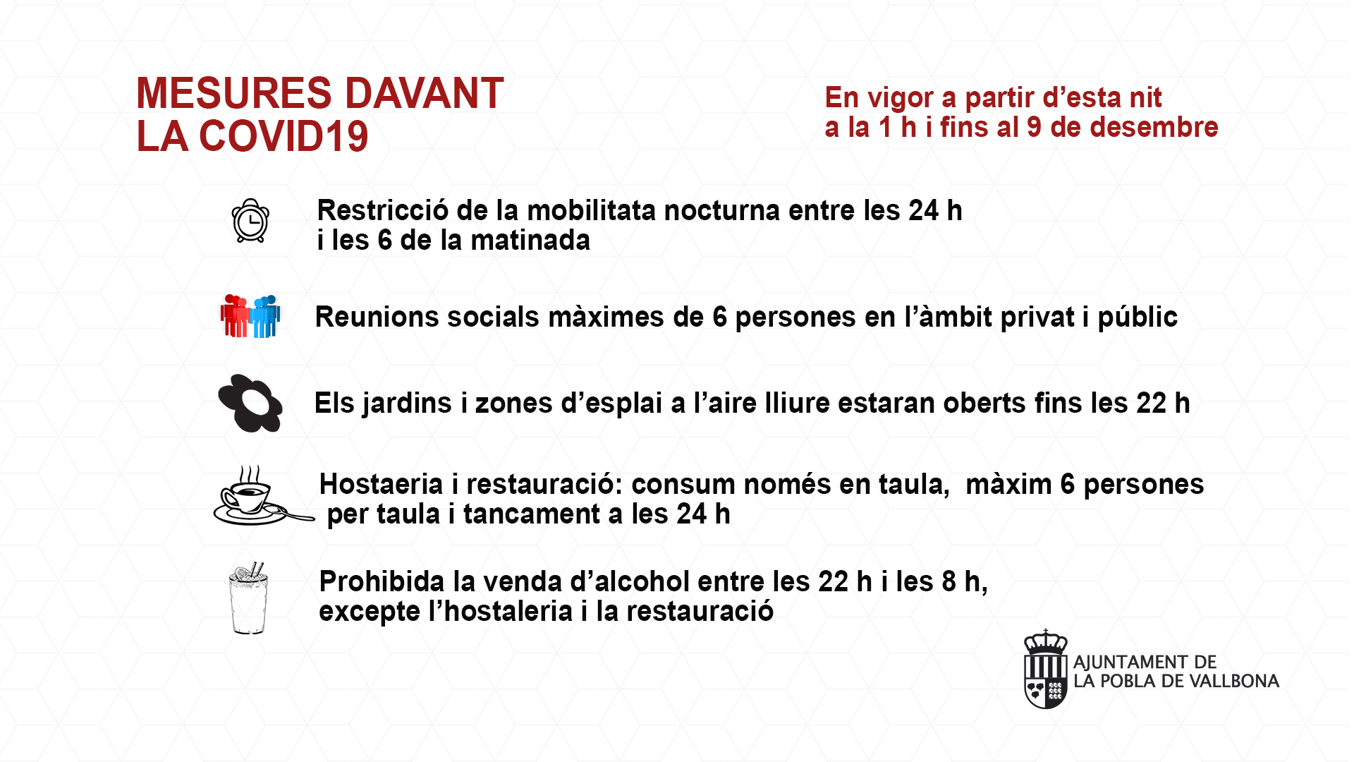 La Generalitat Valenciana ha aprovat mesures de contenció enfront de la *COVID 19 que entren en vigor aquesta nit a la 1 h i fins al 9 de desembre.