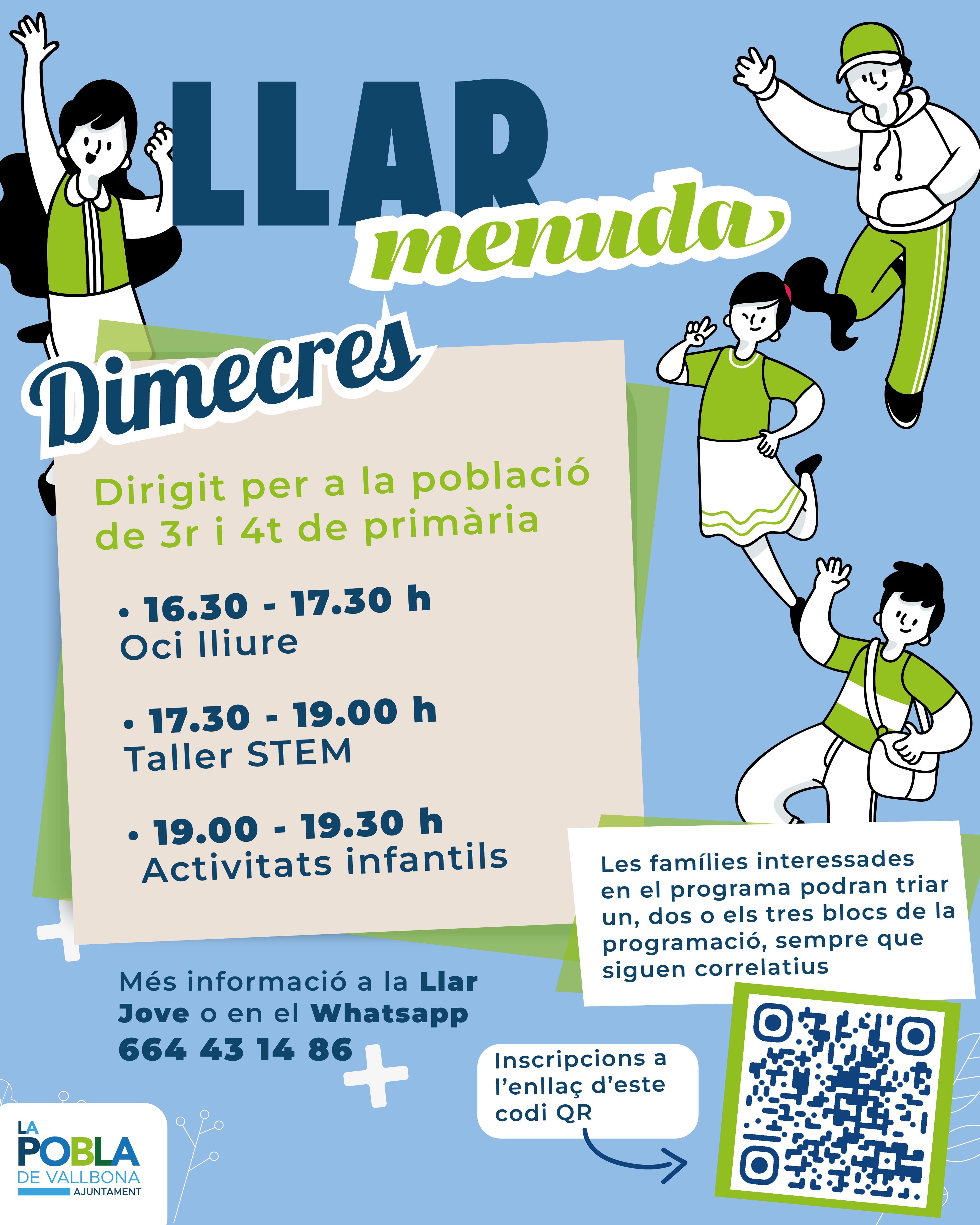 ? La Llar Menuda tindrà lloc tots els dimecres per a la població menuda de 3r i 4t de Primària. El programa inclou tallers, manualitats i un taller STEM, on els participants podran aprendre i experimentar d’una manera lúdica i creativa.