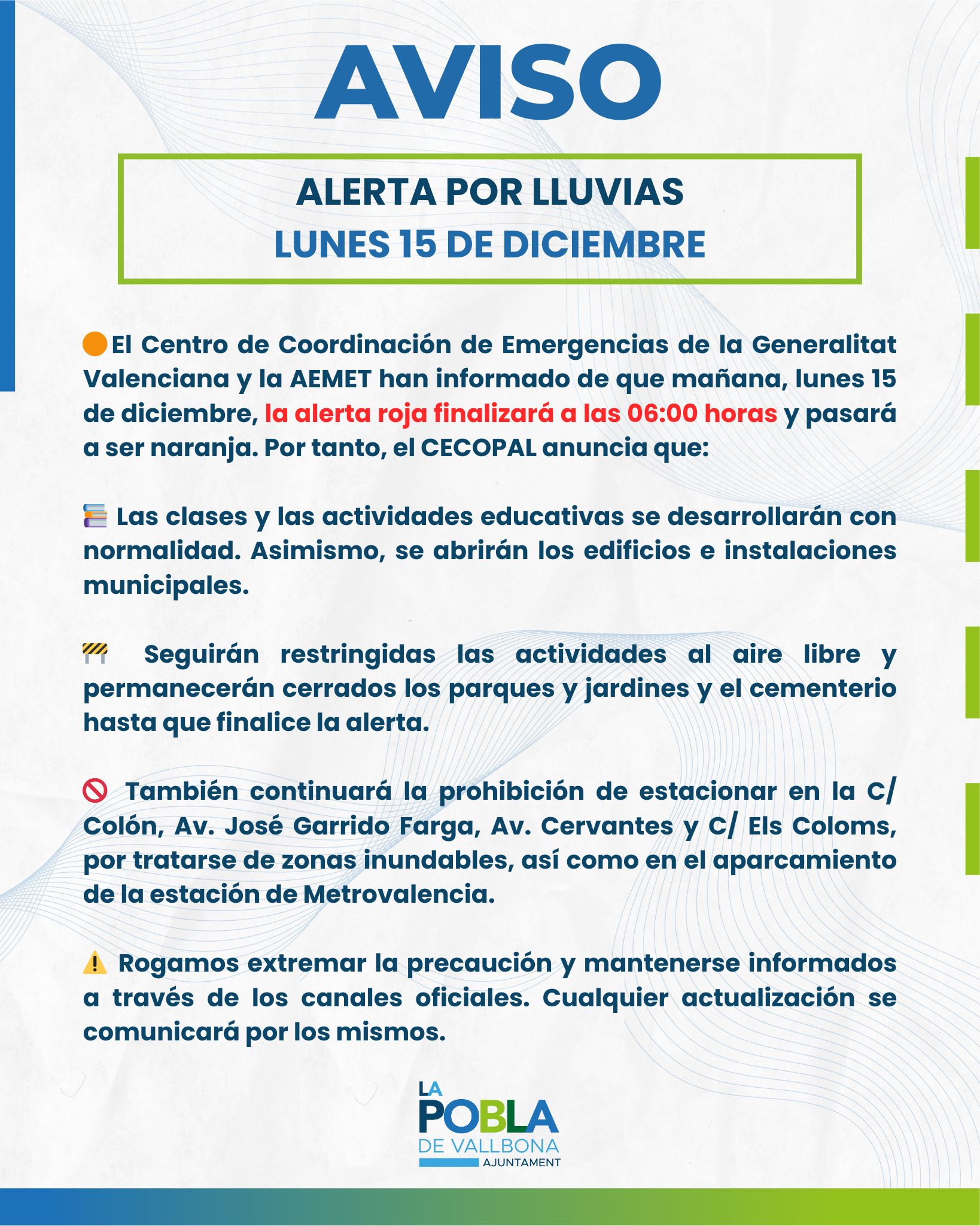 ? El Centre de Coordinació d’Emergències de la Generalitat Valenciana i l’AEMET han informat que demà, dilluns 15 de desembre, l’alerta roja finalitzarà a les 06.00 hores i passarà a ser taronja. Per tant, el CECOPAL anuncia que: